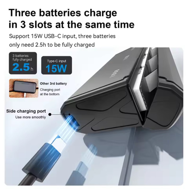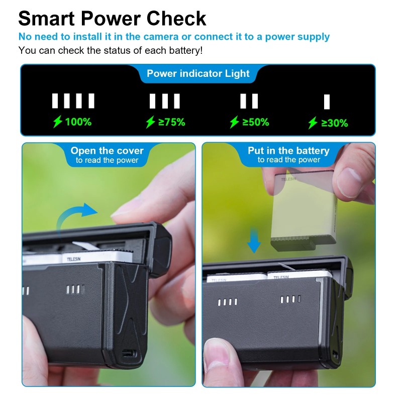·       You can recharge 3 GoPro batteries at the same time using a battery charger from TELESIN. Makes you not need to recharge the battery alternately. In addition to charging the battery, you can also use it to store batteries and store 2 TF cards.