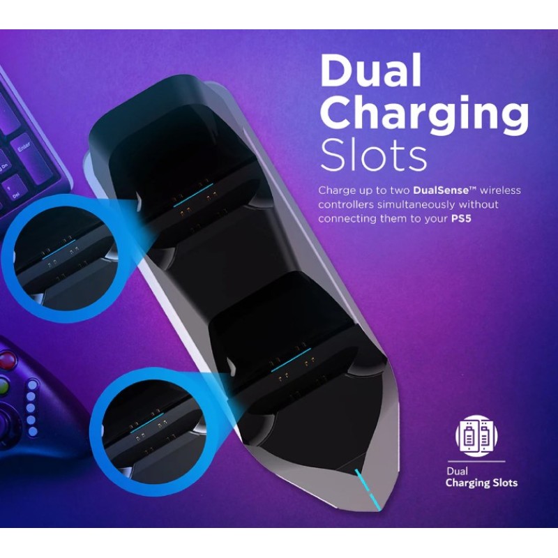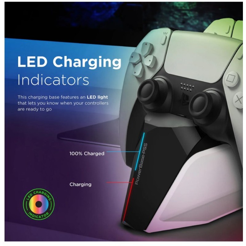 • Keep your DualSense™ controller always charged up and ready to go with PowerBase-PS5. Charge up 2 controllers simultaneously without connecting them to your console, thus saving up on those USB ports.