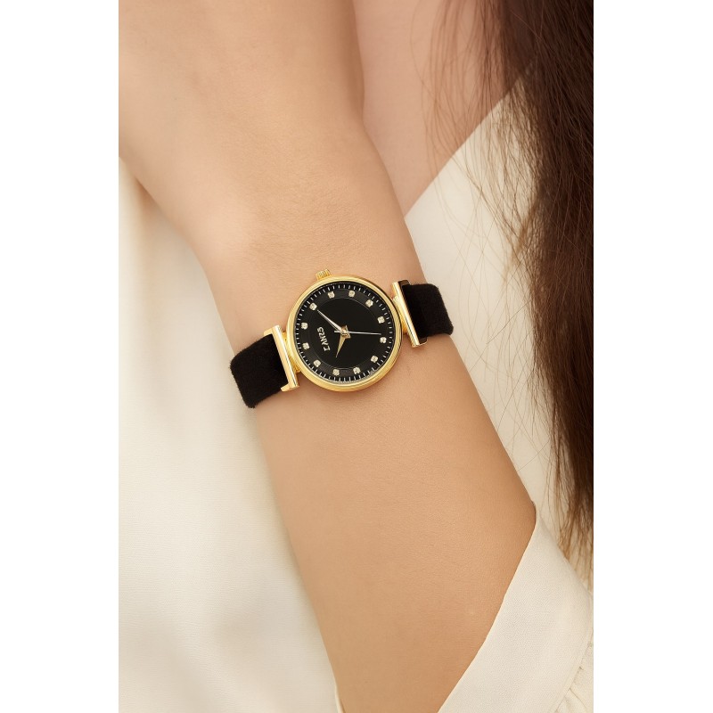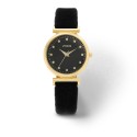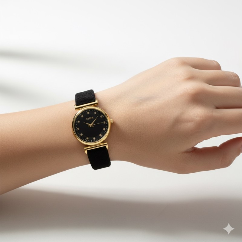 · An elegant watch from Zyros that combines luxury and simplicity. It features a refined design with a gold-tone case that adds a touch of modern elegance, along with a black dial adorned with crystal hour markers. The soft black velvet strap enhances its sophisticated look and provides all-day comfort.