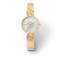 · A luxurious gold watch featuring a bangle strap adorned with fluid Arabic patterns and a brilliant white mother-of-pearl dial.