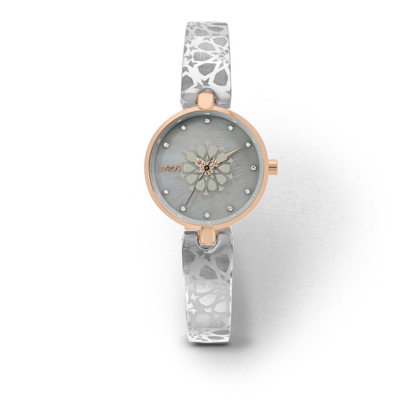 · It features a unique silver-patterned bangle strap and a subtle grey mother-of-pearl dial, encased in a rose gold bezel.