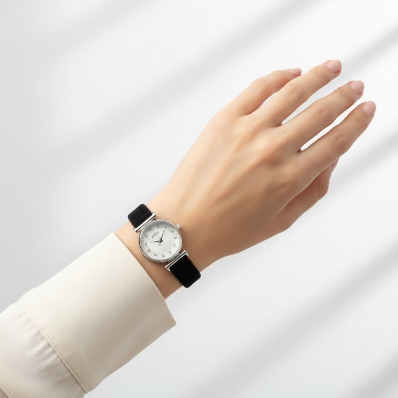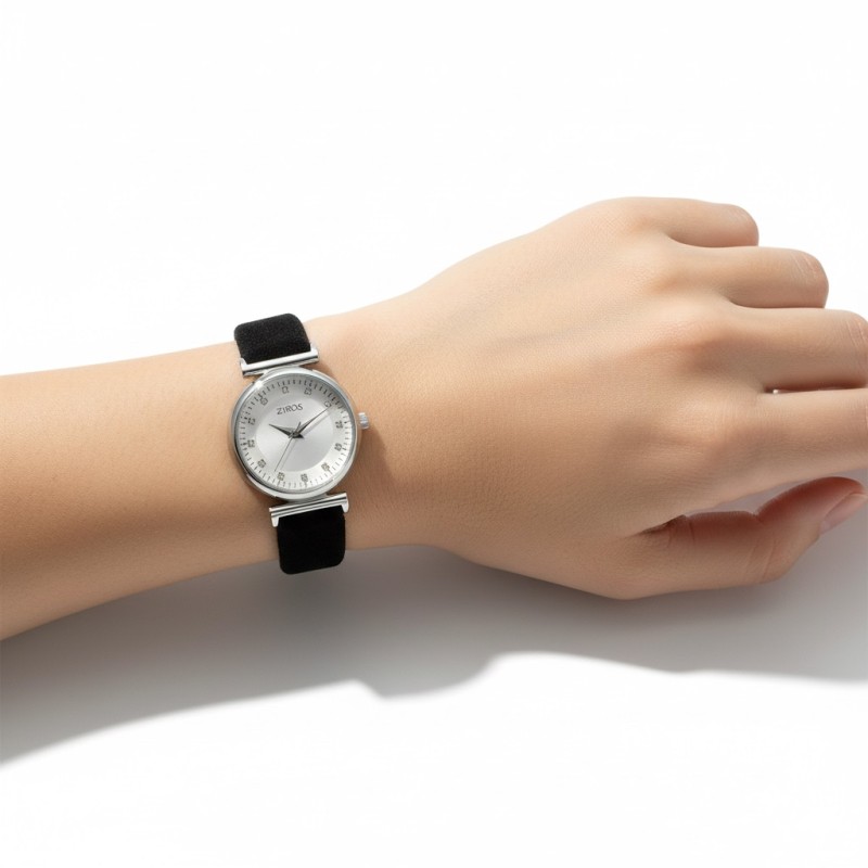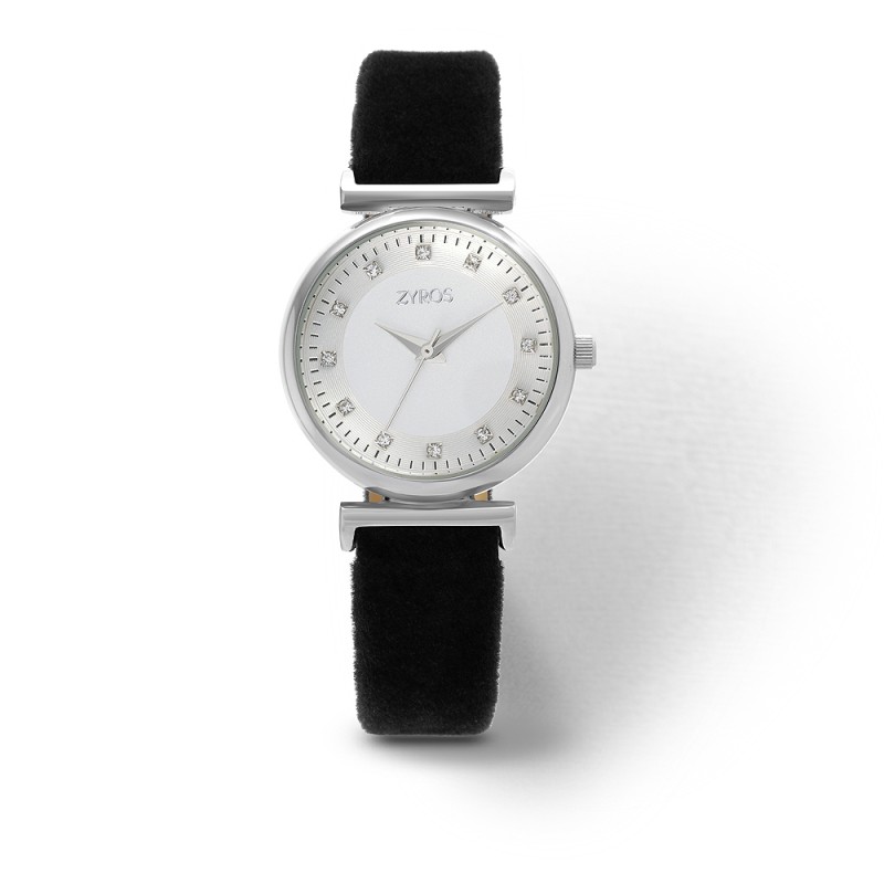 · An elegant watch from Zyros that combines luxury and simplicity. It features a refined design with a silver case that adds a touch of modern elegance, along with a white dial adorned with crystal hour markers. The soft black velvet strap enhances its sophisticated look and provides all-day comfort.